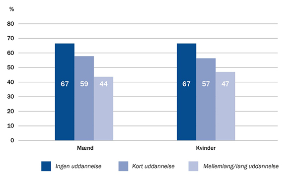 Hele 67% af de personer som ingen uddannelse har er rygere. Anderledes ser det ud blandt de personer som har en mellemlang eller lang uddannelse, her ryger 44% af mændene og 47% af kvinderne.